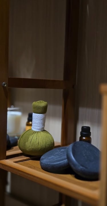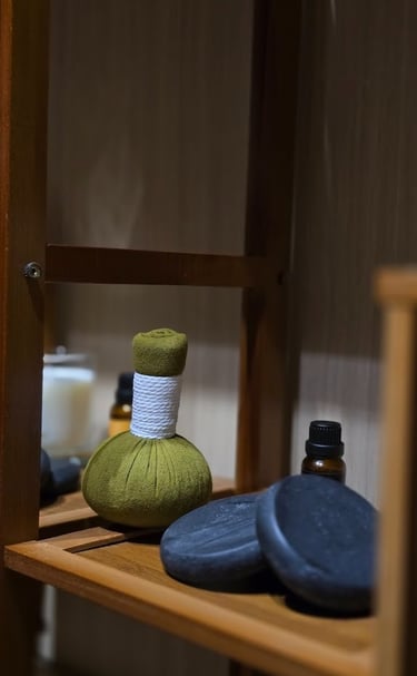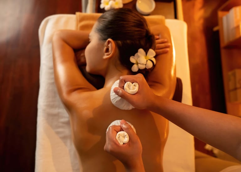 Warm herbal compresses are wrapped in a traditional cloth pouch to relieve muscle pain and promote relaxation.
