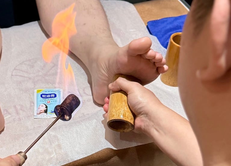 Bamboo cups are used to create suction on the skin, promoting blood circulation.